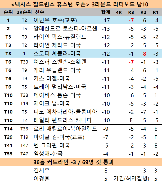 스코티 셰플러의 54홀 합계는 12언더파, 이민우에 5타 뒤쳐졌다.